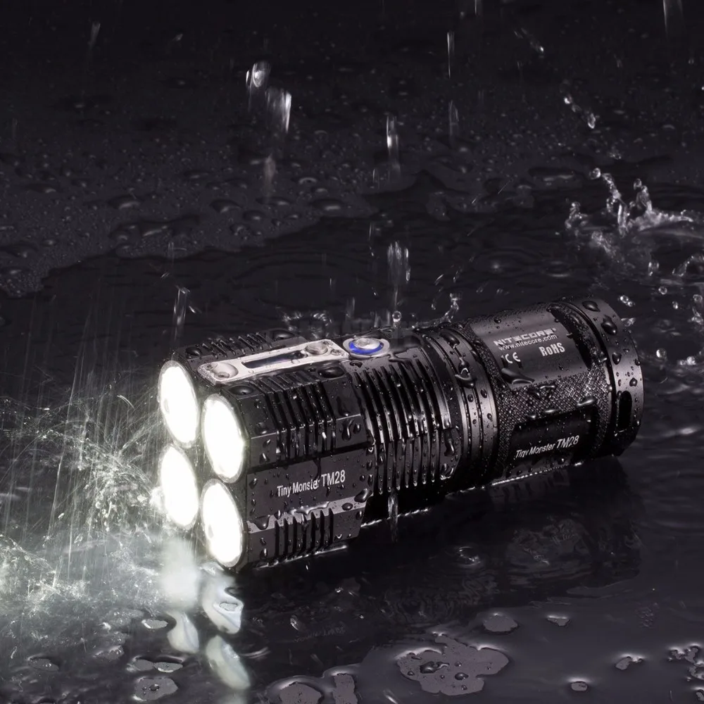 Product Name: NITECORE TINY MONSTER TM28 6000 LMs CREE XHP35 HI 4xLED Rechargeable Hight Light Flashlight Gear Hunting Searching Free Shipping